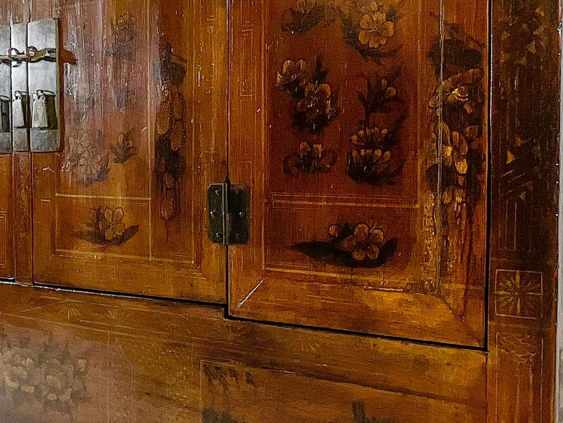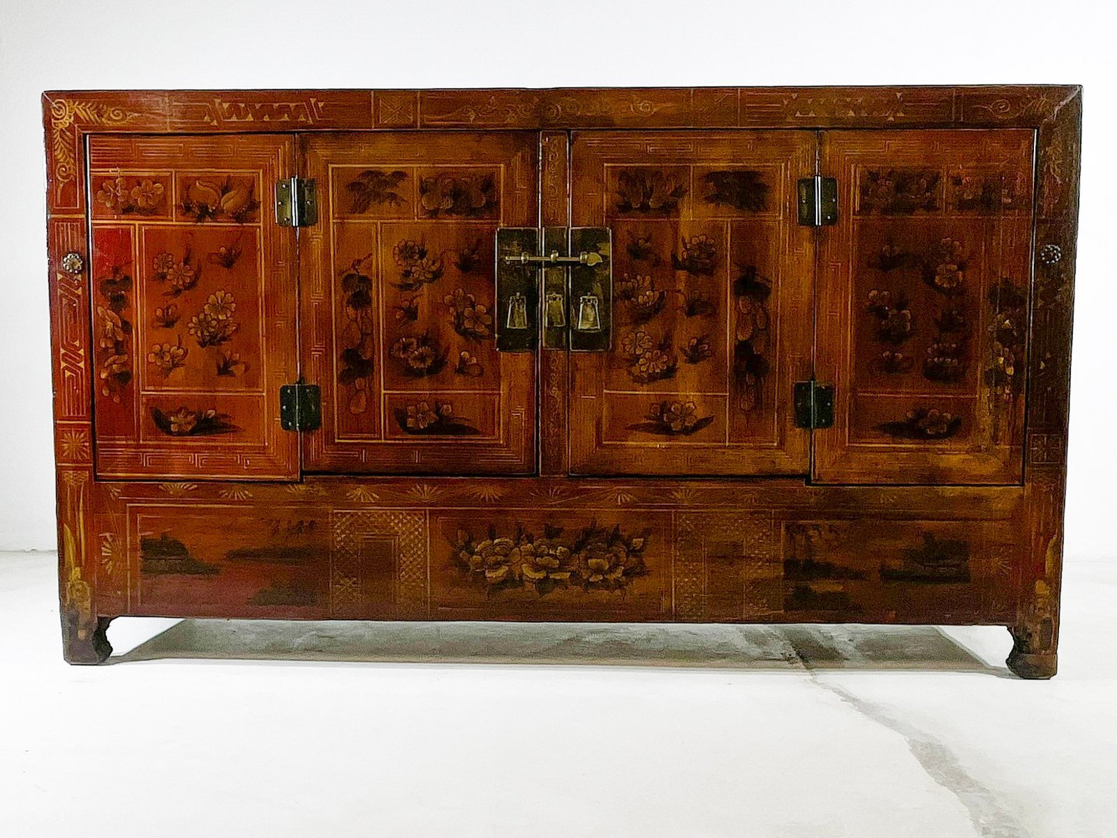 Aparador chino alto compacto Anaranjado Lacado envejecido y elaboradamente pintado a mano con motivos florales. Pieza Insólita. //Republican era, circa 1920. (Shanxi)