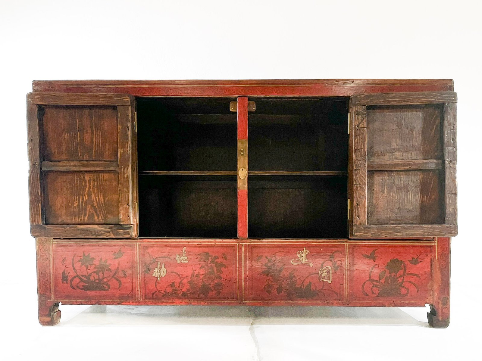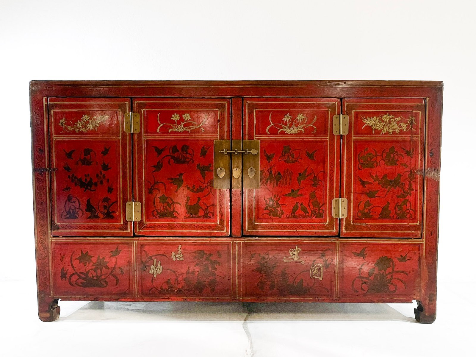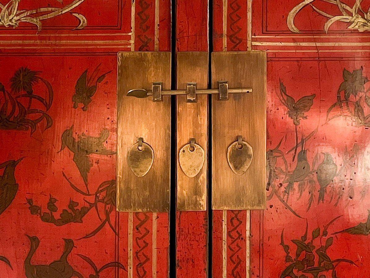 Aparador antigüo chino alto compacto Rojo/Dorado Lacado Y Elaboradamente pintado a mano con motivos de libélulas y motivos florales. Pieza Insólita. //Republican era, circa 1920. (Shanxi)