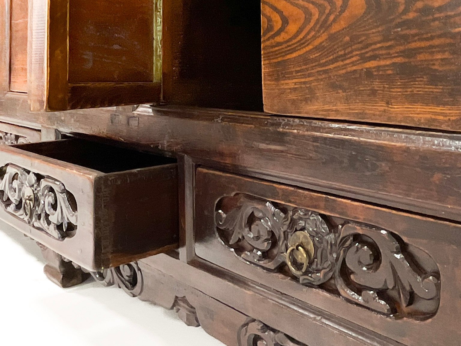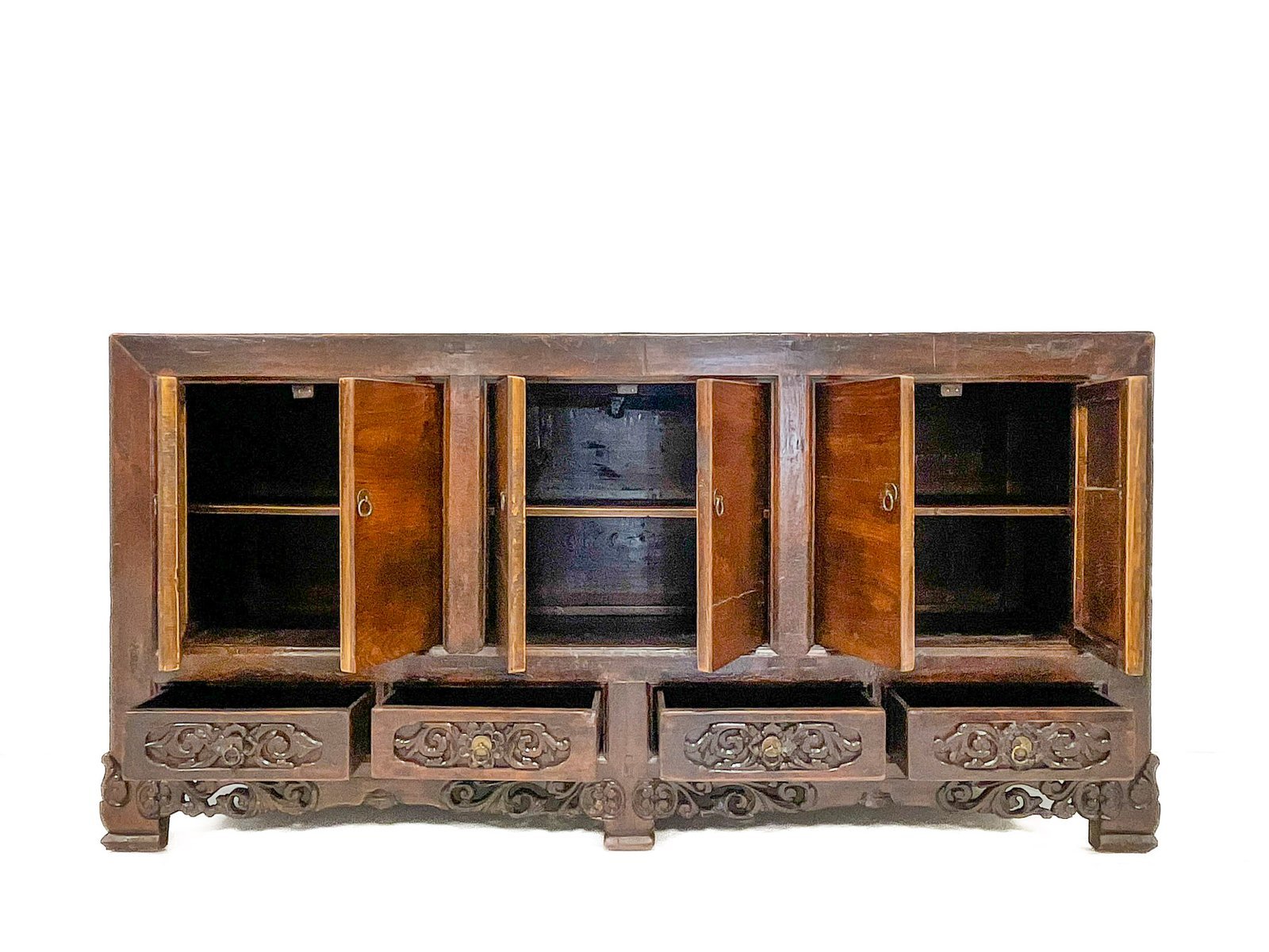 Aparador chino compacto marrón de 3 puertas dobles con cajones inferiores y con tallas de nubes auspiciosas y follaje en el frontal.