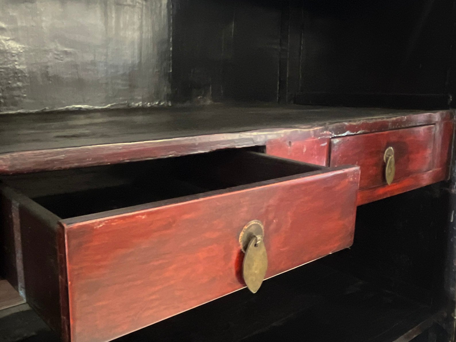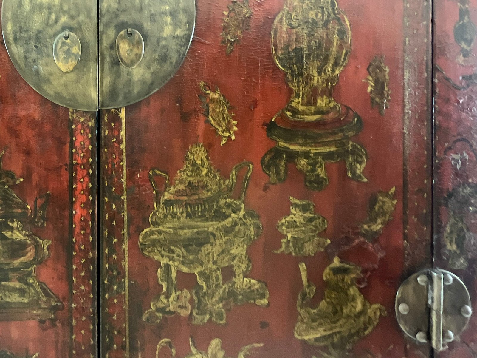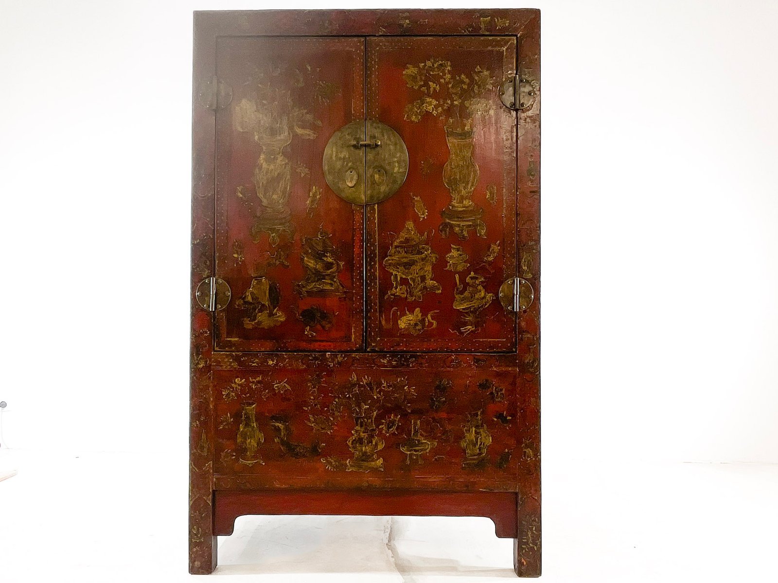 Armario de Boda chino Lacado y Pintado a Mano Laca roja y oro trazados dibujando peonías en flor en un jarrón o, específicamente «bogu», que simboliza prosperidad y buenos auspicios.// Qing era, circa 1880. (Beijing style)
