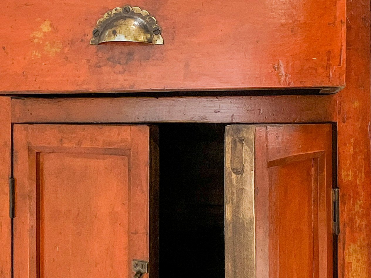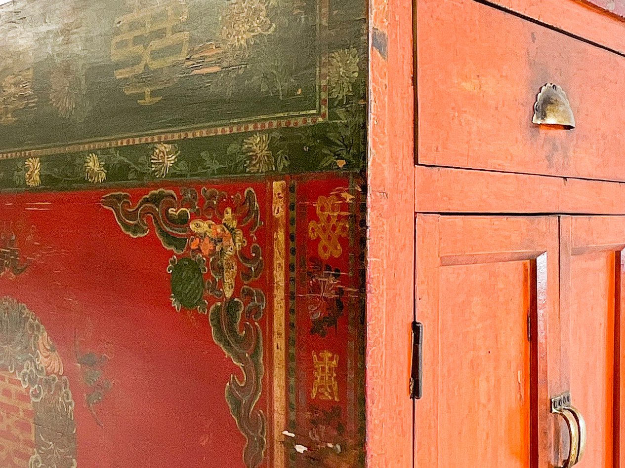 Baúl chino Rojo/Verde Pintado a mano con motivos de doble felicidad 囍 y nudos auspiciosos y adornado con motivos florales. Pieza insólita. //Qing era, circa 1850. (Gansu)