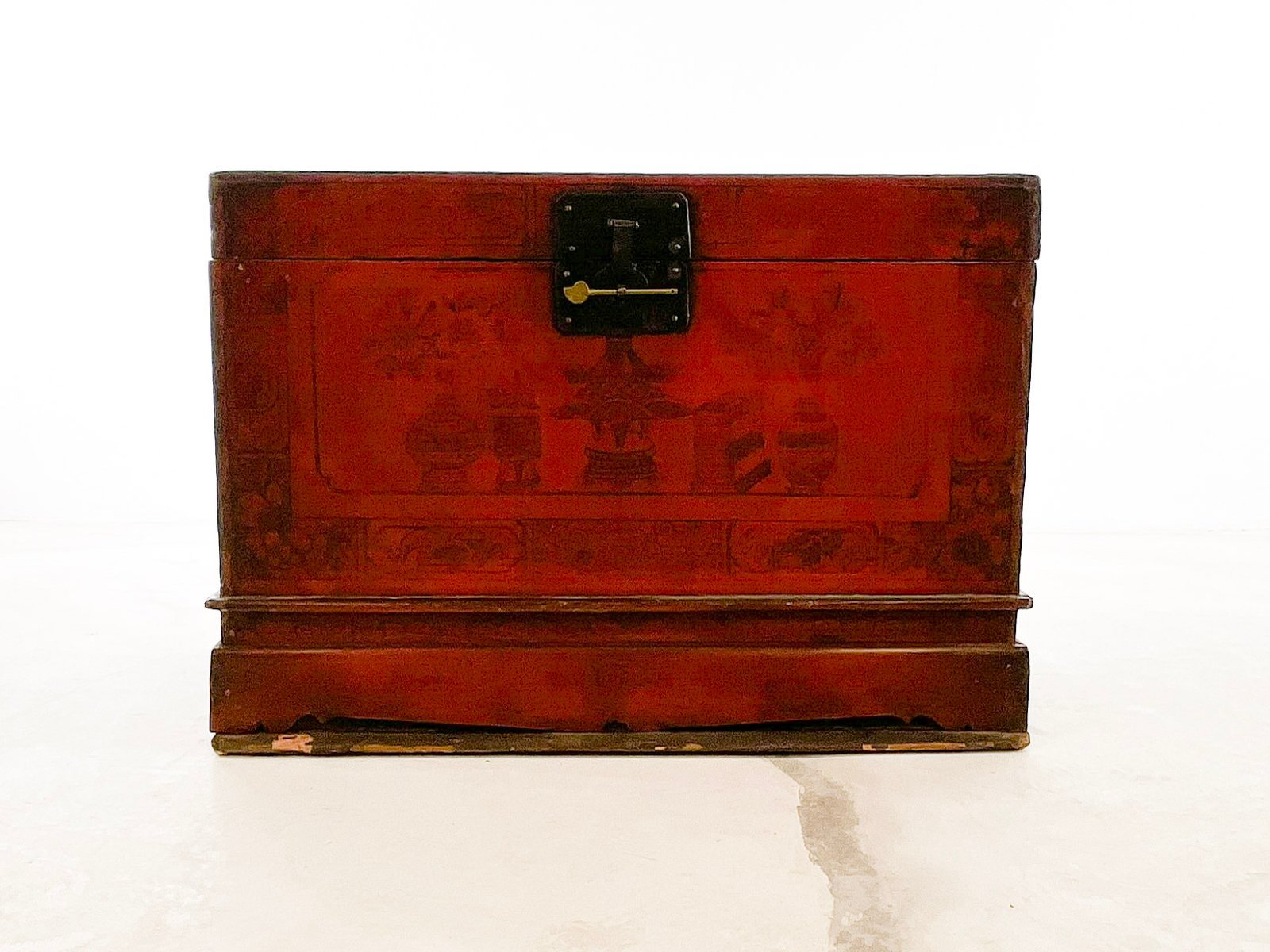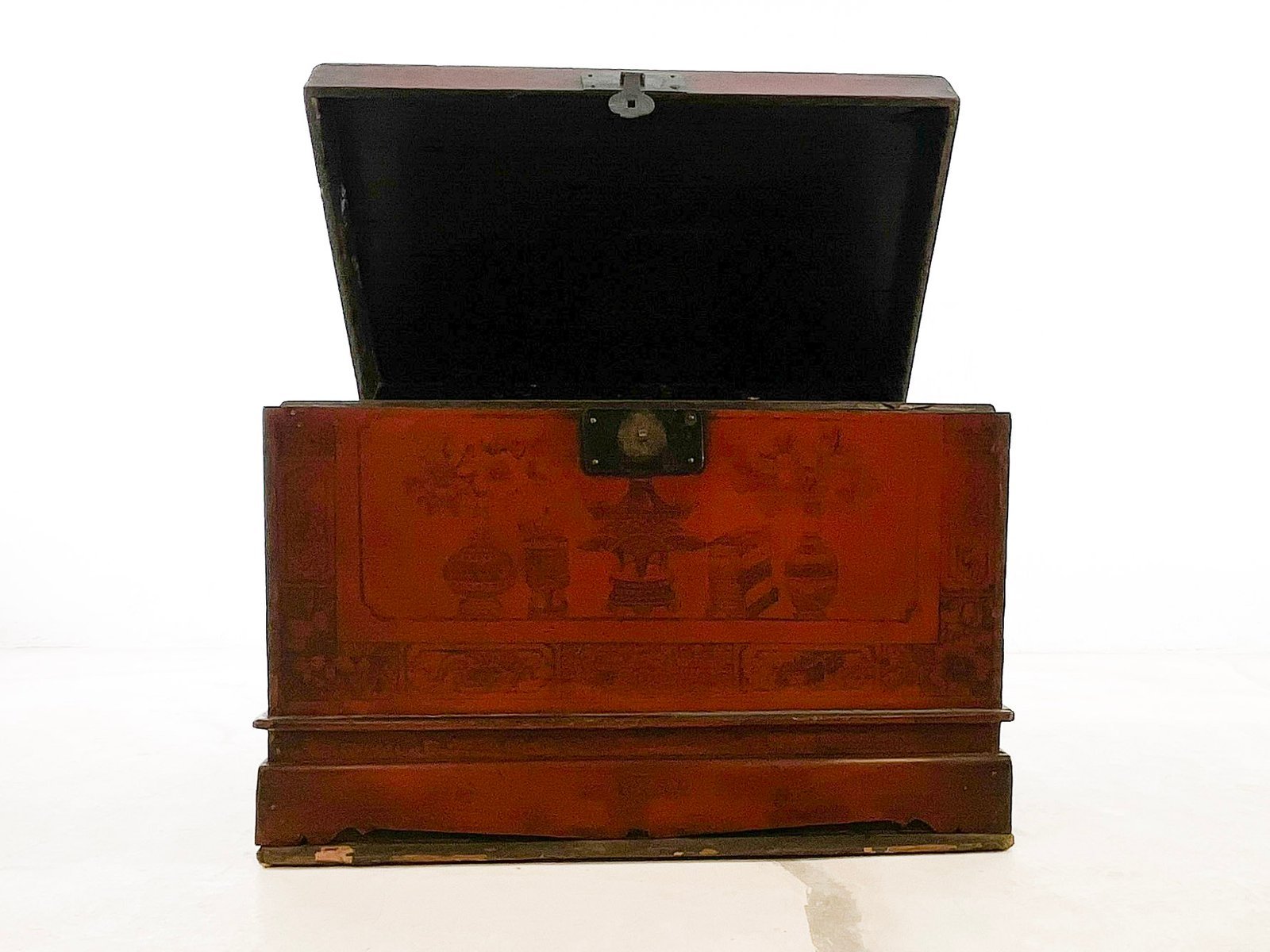 Baúl chino con base. Rojo Lacado y Pintado a Mano con símbolos auspiciosos (motivos Bogu).//Circa 1920s. (Shandong)